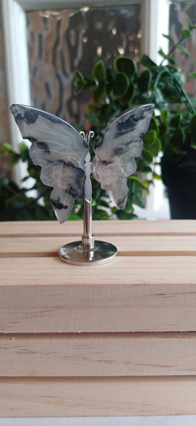 Black Agate Butterfly Wings on silver stand (3 inches). Crystal carving symbolising grounding, strength, protection & transformation.