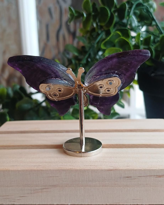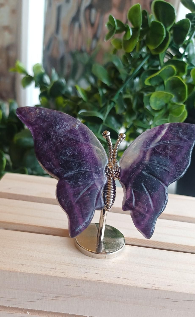 Fluorite Butterfly Wings on silver stand. Available in dark purple or light Fluorite. Crystal carving for clarity, intuition & transformation.