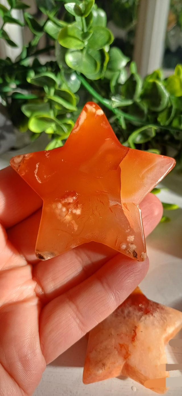 This striking Carnelian and Flower Agate Star showcases the perfect harmony of two complementary stones. Carnelian’s rich orange tones and subtle banding pair beautifully with Flower Agate’s soft pinks, creamy hues and botanical inclusions.