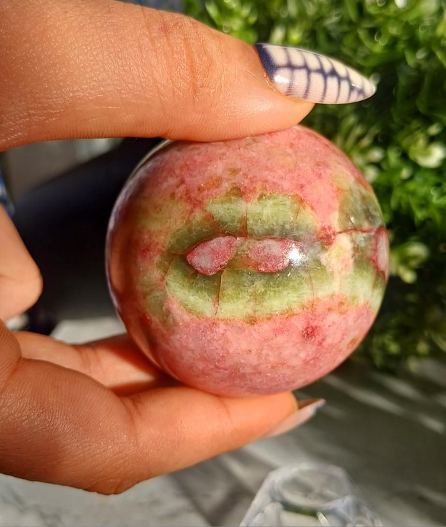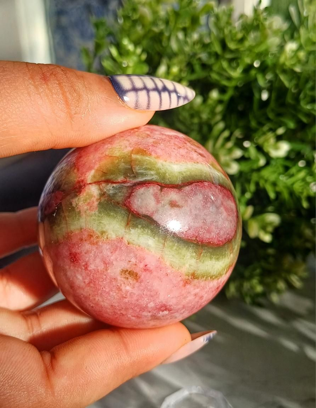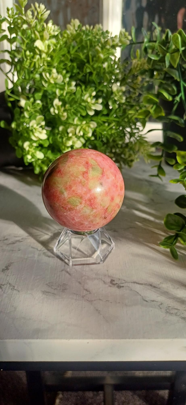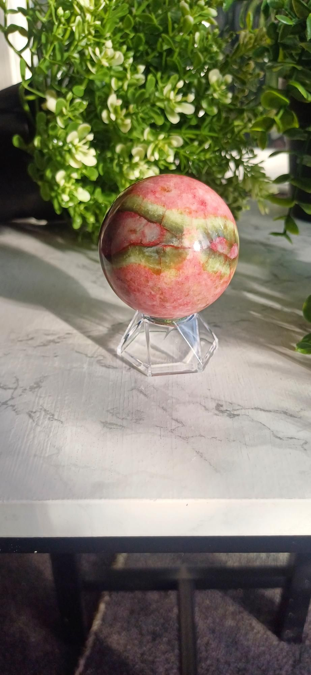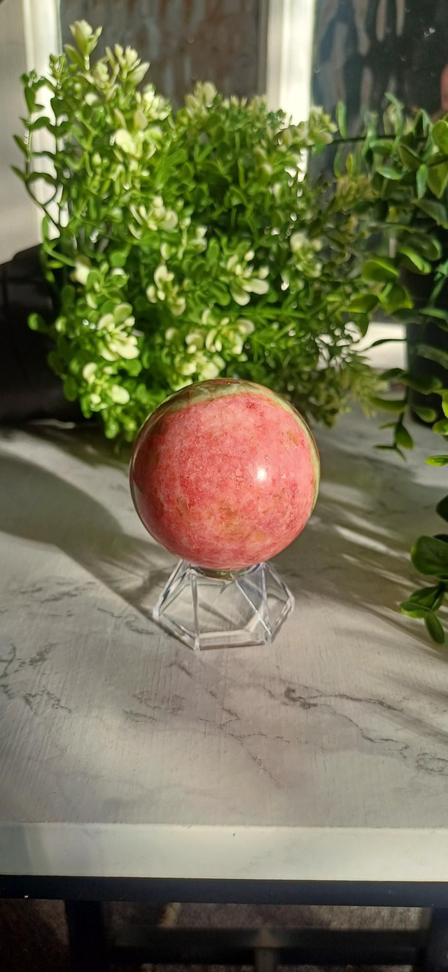This beautiful Thulite with Epidote Sphere is a truly eye-catching piece, showcasing soft to vibrant pink Thulite contrasted with rich green epidote inclusions. The natural combination of these minerals creates stunning depth and texture, with the polished sphere enhancing the stone’s colours and patterns from every angle.